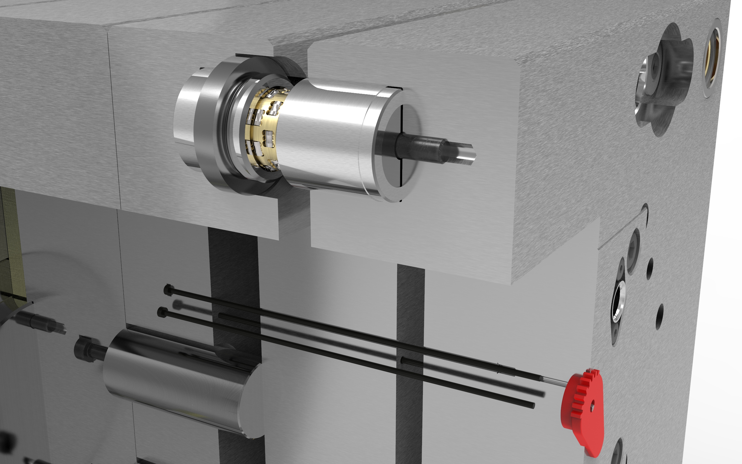 Das Neuprodukt „Systemführung Plus“ der Norm 6701/7231 arbeitet spielfrei und benötigt daher keine zusätzliche Feinzentrierung. Beim Beispiel auf dem Bild werden die Werkzeughälften geführt und zentriert, zusätzlich wird die Auswerferplatte ausgefahren. Der Einbau ist kompatibel mit der hinlänglich bekannten Gleitführung. Dank dem einlegbaren Bund kann die Einheit in verschieden liegenden Plattentrennungen eingesetzt werden. Die Bauteilemenge reduziert sich so enorm.
